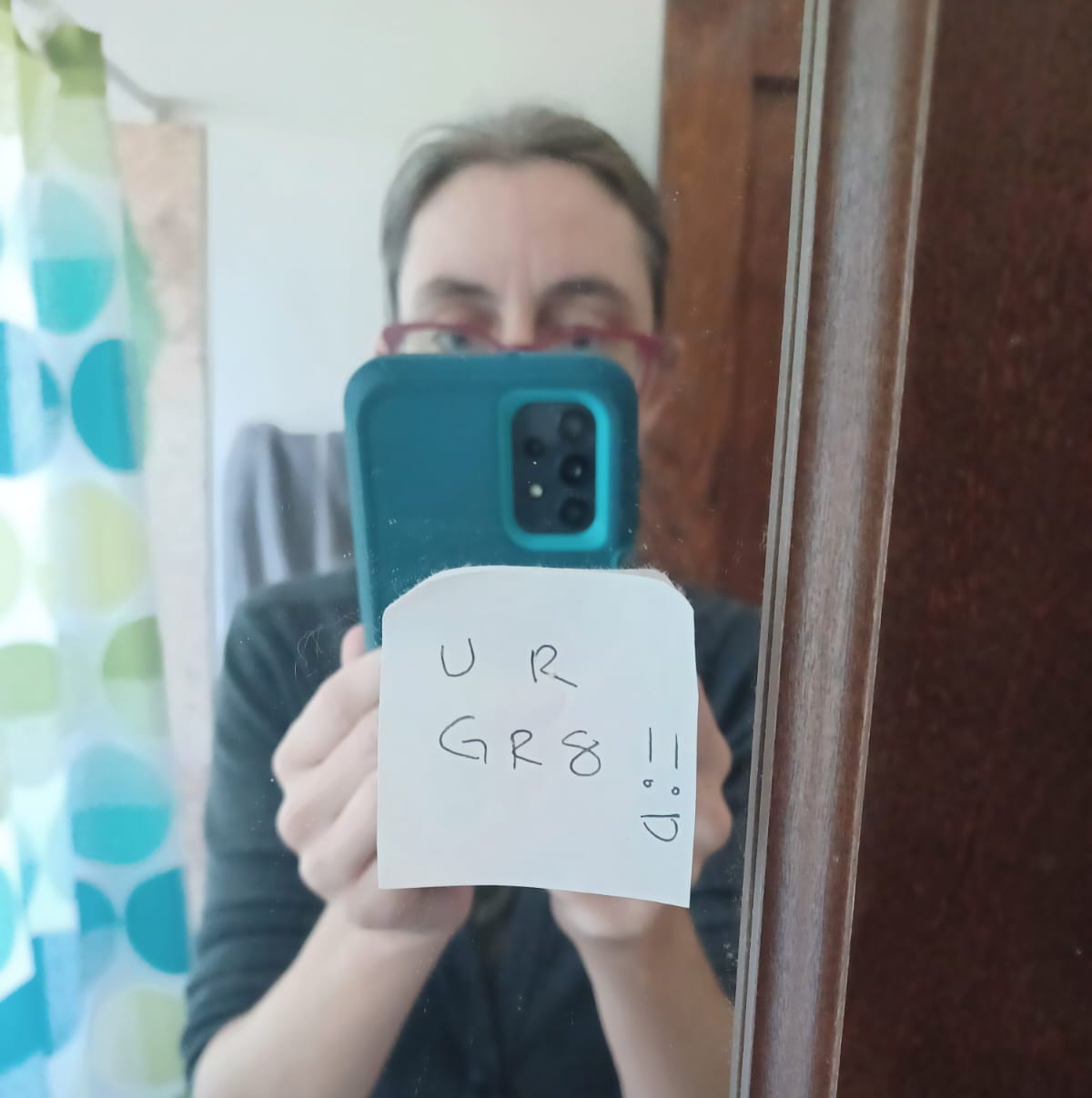 The Post-it compliment I stuck on my friend’s bathroom mirror years ago that’s still up.